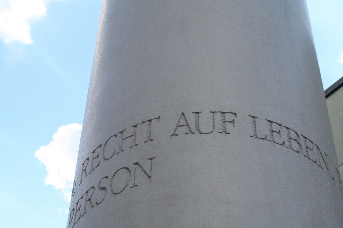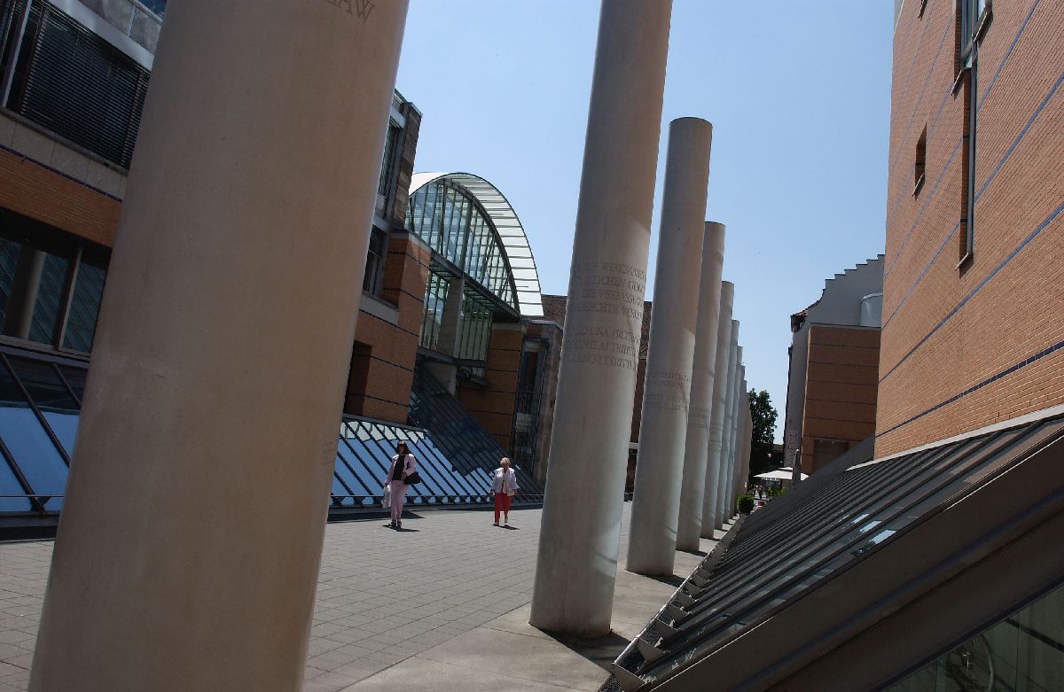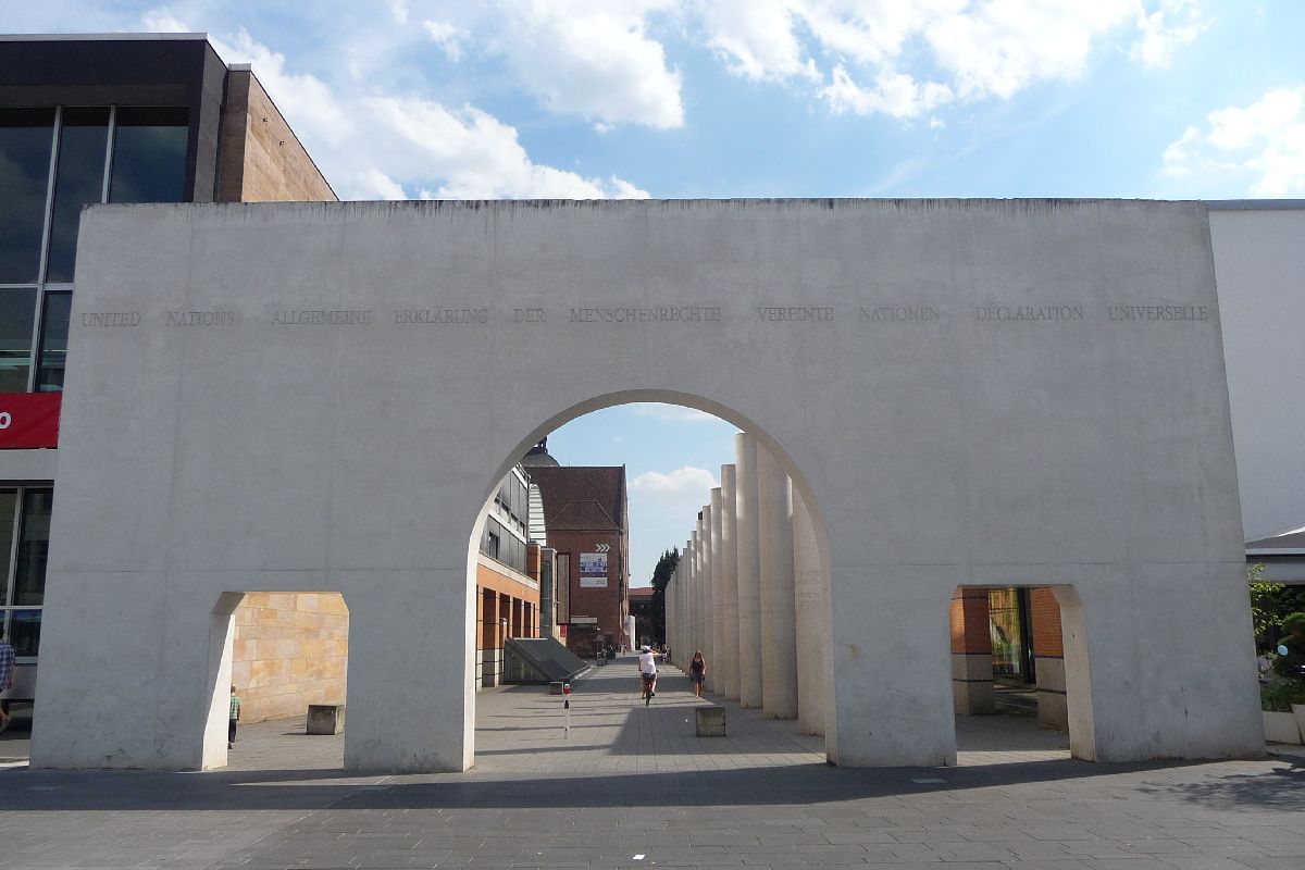 8 Meter hoch sind die 27 Betonpfeiler, die die Straße der Menschenrechte vom Kornmarkt her nach dem Gang durch einen stilisierten Triumphbogen säumen. In jeder von ihnen ist, wie auch in der unterbrechenden Pfeilereiche und in zwei Bodenplatten, ein Artikel der Allgemeinen Erklärung der Menschenrechte in deutscher sowie in jeweils einer anderen Sprache eingemeißelt.